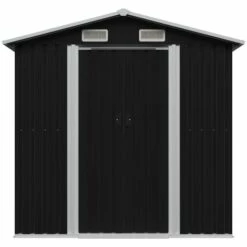Abri de jardin en métal – Surface hors tout : 4,07m² – Surface utile : 3,60m² – 2 portes coulissantes intérieures L96xH162cm – Dimensions : 213x191x195cm – Kit d’ancrage inclus – Coloris : gris anthracite.