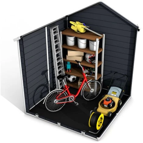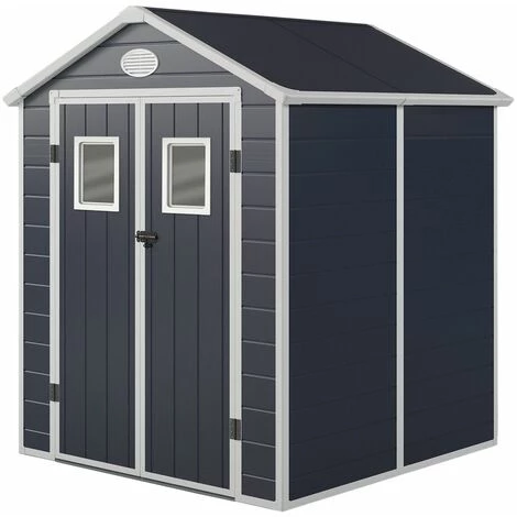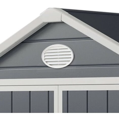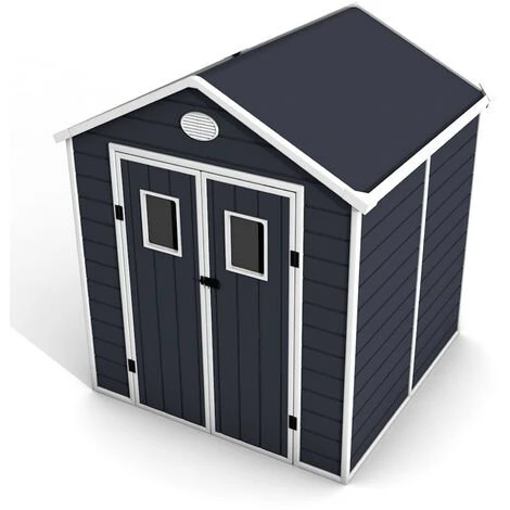 Il présente un design contemporain gris anthracite et un toit à deux pans pour empêcher l’accumulation de la pluie. De plus, sa porte double pliante est équipée d’une serrure qui peut être munie d’un cadenas (non inclus). Sa porte est dotée de deux fenêtres qui laissent entrer la lumière pour que les tâches puissent être effectuées à l’intérieur et sa grille d’aération supérieur permet une bonne ventilation.
