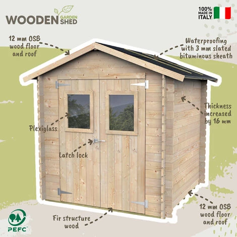 Fabriqué en bois de sapin robuste, avec une conception et une production entièrement Made in Italy, le toit est recouvert d’une gaine en bitume qui, avec le plancher en bois perlé de 16 mm, garantit des niveaux élevés d’isolation et de protection ; l’épaisseur accrue des murs, en plus de le rendre encore plus isolé des agents atmosphériques, garantit un niveau de stabilité plus élevé.