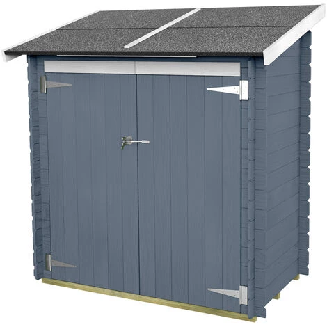 Fabriqué en bois d’épicéa robuste coloré en gris, avec serrure à vérrou, la toiture en bois OSB de 12 mm, comme le sol, est recouverte d’une gaine bitumineuse ardoise de 3 mm, qui garantit isolation et protection aux performances maximales.