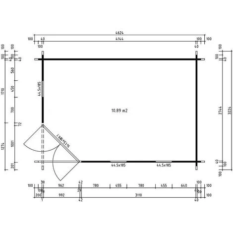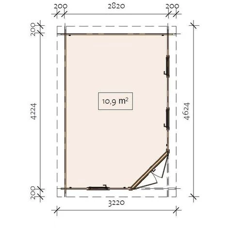 - Dimensions extérieures des madriers : 442 x 302 cm