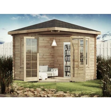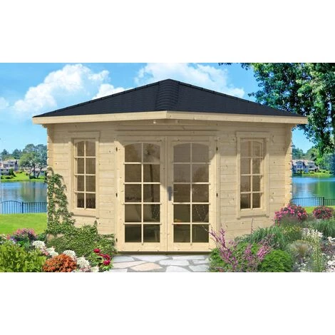 Notre abri de jardin pentagonal Victor de la marque Alpholz est une vraie pièce maîtresse avec ses planches de bois modernes et son toit double pente en bois massif. La double porte de haute qualité est ornée de meneaux aux fenêtres, lui conférant ainsi un aspect chaleureux. Cet abri de jardin offre des parois de 44mm d’épaisseur.
