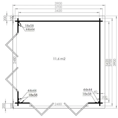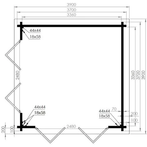 - Dimensions extérieures des madriers : 370 x 370 cm