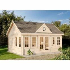 Laissez vous convaincre par notre chalet de jardin au design féérique. Les huit fenêtres baignent de lumière les différentes pièces toute la journée et créent une atmosphère chaleureuse. La principale caractéristique de ce chalet est le pignon décoratif au-dessus de la double porte vitrée, traditionnellement décorée par une horloge.