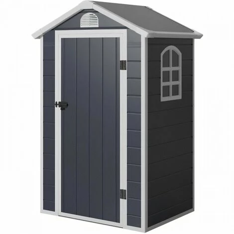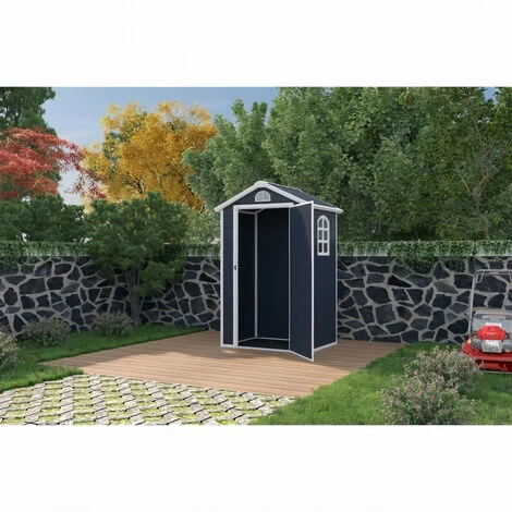 Abris – 1,39 m² – Plancher inclus – Gris foncé – Surface au sol : 120 x 92 cm soit 1.1 m² – Dim HT : 134 x 104 x H.204 cm soit 1.39 m² – Materiel: plastique (epaisseur: 12 mm) et acier galvanisé (epaisseur: 1,5 mm) – 1 fenetre vitre en polycarbonate – Toit double pente – Porte simple pleine verouillable (cadenas non inclus).