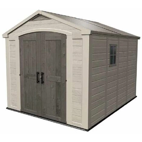 Abri de jardin en polypropylène, aspect bois, équipé d’une double porte verrouillable, d’une surface intérieure de 7,4 m2.