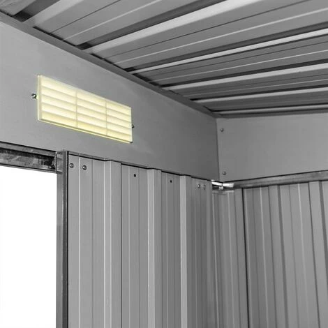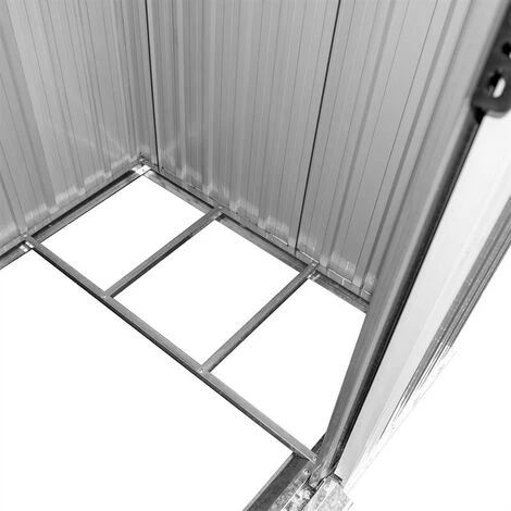 Notre abri de jardin est constitué d’ une construction mé tallique robuste et sa stabilité est renforcé e par la fondation mé tallique incluse. La fondation peut servir de base à un revê tement de sol en bois. L’ abri mé tallique est é quipé d’ un toit monopente qui assure l’ é vacuation de la pluie. Les coins du toit ont une protection des bords. La porte coulissante à double battant offre un espace de rangement supplé mentaire et peut ê tre ouverte à tout moment, mê me en hiver lorsqu’ il neige.