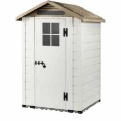 Abri en résine Tuscany Evo 120, se caractérise par son design bicolore original et attrayant et par sa toiture en imitation tuile d’une grande solidité. Inclus une fenêtre frontale sur la porte battante ce qui apporte de la lumière à l’ intérieur, il a aussi une grille d’ aération. En plus, cet abri en résine a un plancher composé d’une dalle WPC de 45 mm d’épaisseur .