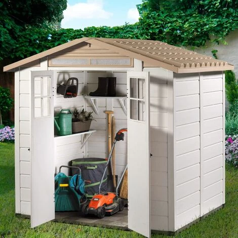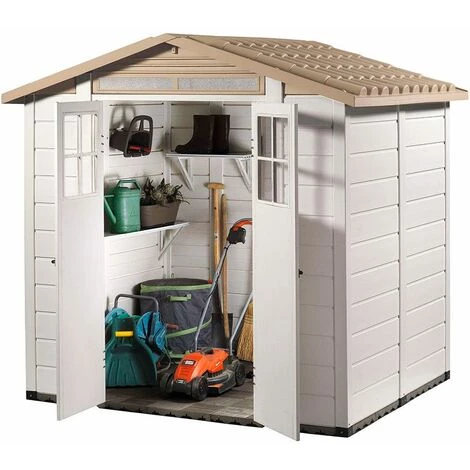 Abri en résine Tuscany Evo 200, se caractérise par son design bicolore original et attrayant et par sa toiture en imitation tuile d’une grande solidité. Incluse une double porte battante avec fenêtre qui apporte de la lumière à l’intérieur et a aussi une grille d’ aération. En plus, cet abri en résine a un plancher composé d’une dalle WPC de 45 mm d’épaisseur.