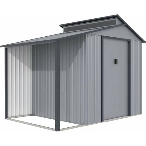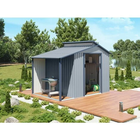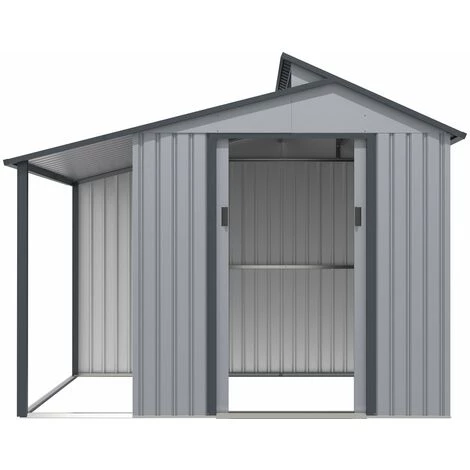 Abri de jardin métal avec pergola « Madras » – 5.64 m² – Dimensions : 193 x 292 x 229 cm – Gris – Structure : métal (zinc) – Dimensions extérieures : 181 x 276 x 229 cm – Dimensions intérieures : 177 x 272 x 162 cm – 2 portes coulissantes avec poignées (dimensions : 96 x 177 cm) – 4 barres de renfort – Anti-UV – Anti-rouilleCet abri de jardin en mé : Abri de jardin métal avec pergola Madras.