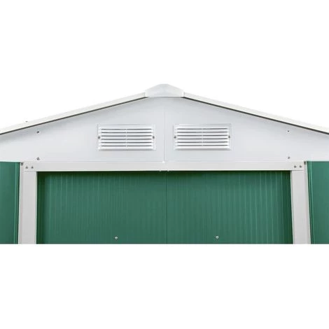 Abri de jardin métal couleur vert et blanc – Dimensions hors tout : L 1,27 x l 2,13 x H 1,95 m – Kit d’ancrage sur béton inclus -L’abri de jardin parfait PLUS D’ESPACE