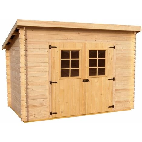 Abri emboîté de 20 mm sans plancher fabriqué en sapin massif. Porte avec fenêtre intégrée. Toit avec pente de forme moderne avec pente arrière (vue faible de la couverture) en plaques ondulées pour une plus grande longévité. Grande de façade de 3m. À lasurer.