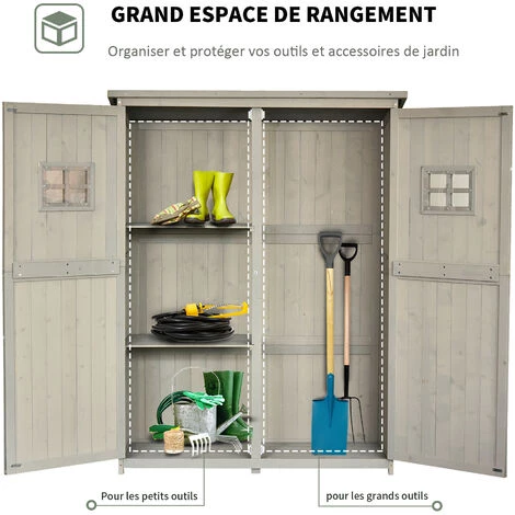 Sobre et chic, l’abri de jardin Jarod de MYCOCOONING offre de beaux espaces de rangement et apporte une touche de décoration raffinée à vos extérieurs. Il dispose d’un grand espace pour les outils à manche et d’un second avec étagères pour organiser vos petits outils. Fabriqué en bois de sapin massif, il est robuste et il a été lasuré pour résister aux UV. Ses 4 pieds robustes isolent son contenu de l’humidité du sol. Les 2 portes avec poignées s’ouvrent facilement et isolent parfaitement le contenu de cette armoire de jardin.