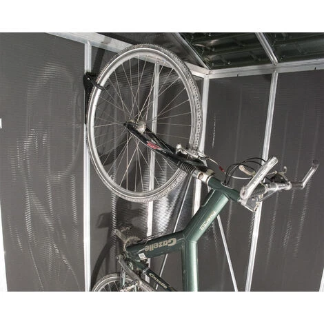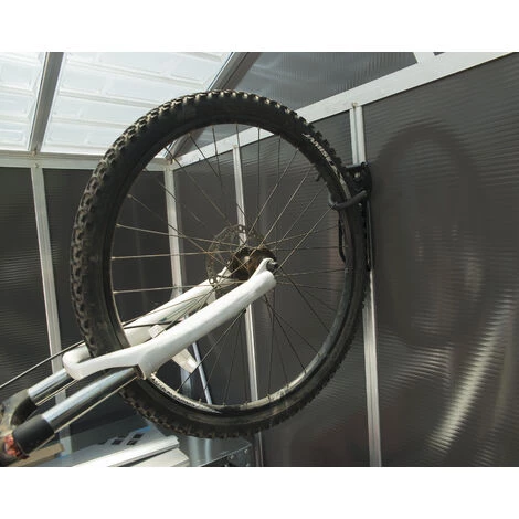 Facile et rapide à installer, accrochez simplement votre roue avant sur le crochet recouvert de caoutchouc et posez la roue arrière contre le mur pour un rangement vertical peu encombrant.