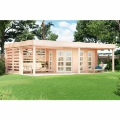 Caractéristiques Longueur: 598 Largeur: 275 Épaisseur: 28 Matière: Bois Description de l’article : Dimensions extérieures : 450 x 250 cm + 150 cm Dimensions du soubassement : 430 x 230 cm Toit ouvrant stable : environ 150 cm Hauteur totale : environ 228 cm (pour une sélection avec une épaisseur de paroi de 40 mm : [...]