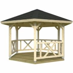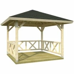 Caractéristiques Surface intérieure: 9 Longueur: 12 Largeur: 300 Épaisseur: 19 Type de bois : Épicéa Matière: Bois Vainqueur du test : Le pavillon de jardin Betty a été récompensé par « Haus & Garten Test ». Description de l’article : Dimensions du soubassement : 300 x 300 cm Porte-à-faux du toit circonférentiel : 43 cm Surface du toit : [...]