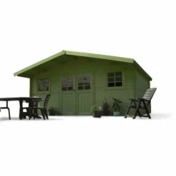 Remarques : – Vérifier que l’accès au point de livraison soit possible par une semi-remorque – Pas de livraison vers les îles sans pont avec le continent : Abri jardin bois Zürich – 19.71 m² – 508 x 388 x 253 cm . Structure : Bois traité autoclave. Surface intérieure (m²) : 17.65 m². Surface extérieure (m²) : 19.71 m². Intérieures : 484 x 364 x 191 cm. Extérieures : 508 x 388 x 253 cm. Hors tout : 529 x 455 x 253 cm – 24.80 m². Hauteur des murs : 191 cm Epaisseur des madriers (côté) : 28 mm. Hauteur faîtage : 253 cm. Dimensions : 159 x 174 cm. Type : Porte double. Fenêtre : 2 fenêtres S’ouvrent en oscillo-battant. Épaisseur : 28 mm. Origine : Belgique. Type de toiture : Feutre bitumé Epaisseur du toit : 16 mm Résiste aux intempéries (75 kg/m²) Résiste au vent (30 kg/m²). Surface de la toiture : 23.74 m². Pourcentage de la pente : 14 °. : Système d’aération Surface à peindre : 44.20 m² Rebord d’entrée Verres de sécurité Poignée de sécurité pour enfants. Dimensions de la dalle béton : 568 x 388 cm. Colisage : 1 colis : – 5,43 x 1,1 x 0,52 m, 980 kg. Dimensions : 18 – 20 m².